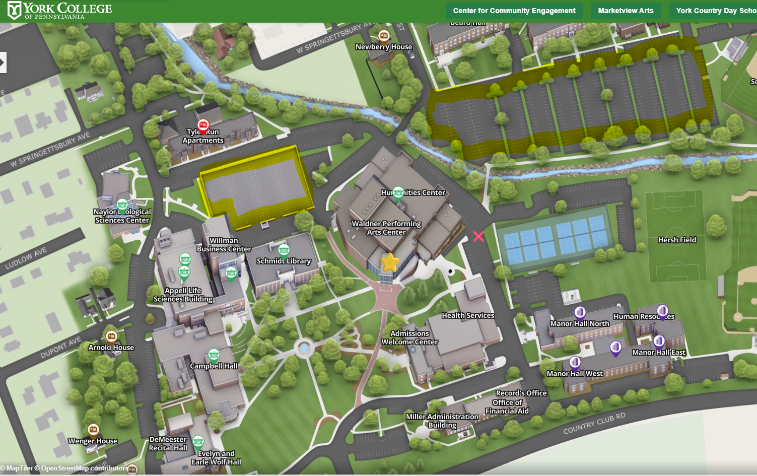 Parking and Directions Enter the York College campus from the main entrance on Country Club Road. Follow the road to the right, then turn left around the rear of the Humanities building. Parking is available in the lots on your left — any non-reserved space is open to guests. From the lot, follow the path to the front of the Humanities building and enter through the Waldner PAC main entrance.