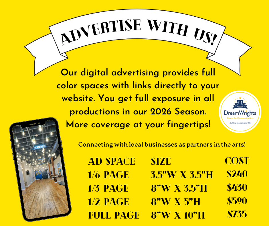 Our digital advertising provides full color spaces with links directly to your website. You get full exposure in all seven productions in our 2026 Season. Over 5,000 patrons received a link to our 2025 playbill. We hope to increase that this year!